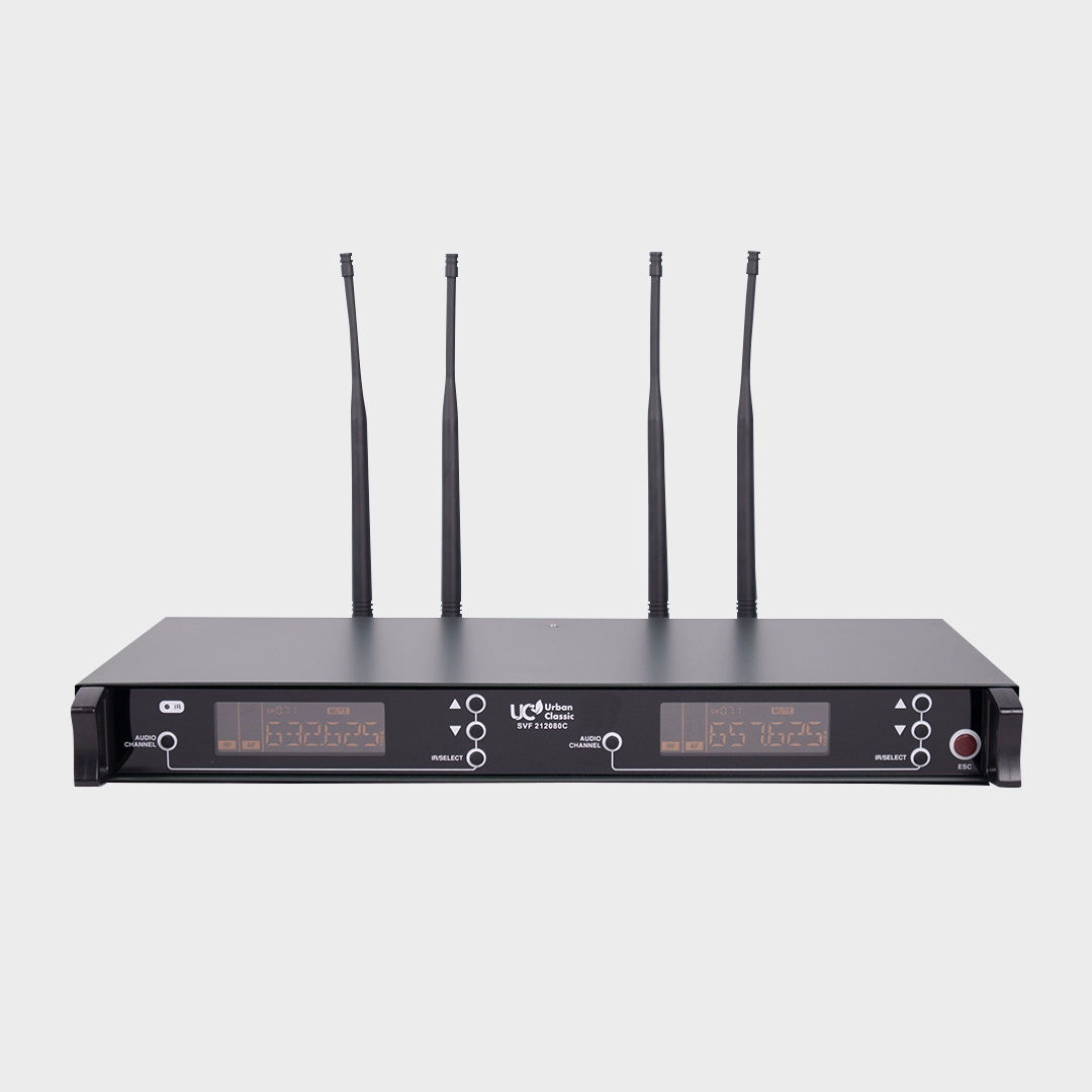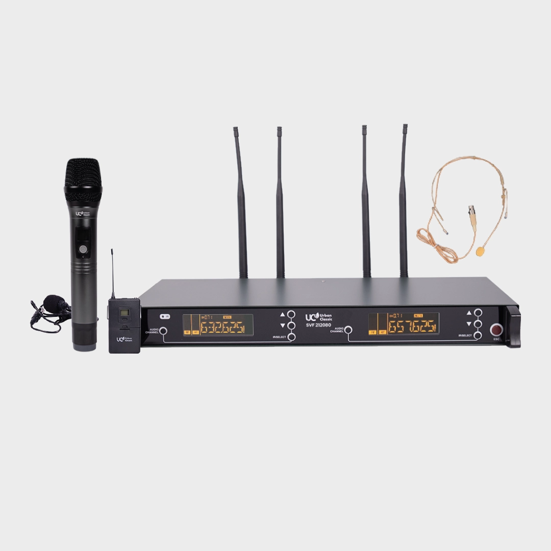 The Urban Classic SVF 212080 is a professional wireless microphone system with a powerful 90m operating distance, ensuring crystal-clear audio for public speaking, classrooms, and live performances. It includes 1 handheld mic and 1 bodypack with collar mic and headset, giving you versatile options for any event. With ACR/IR Sync technology, setup is fast and effortless, while the 470–786MHz frequency range guarantees a stable, interference-free connection.
