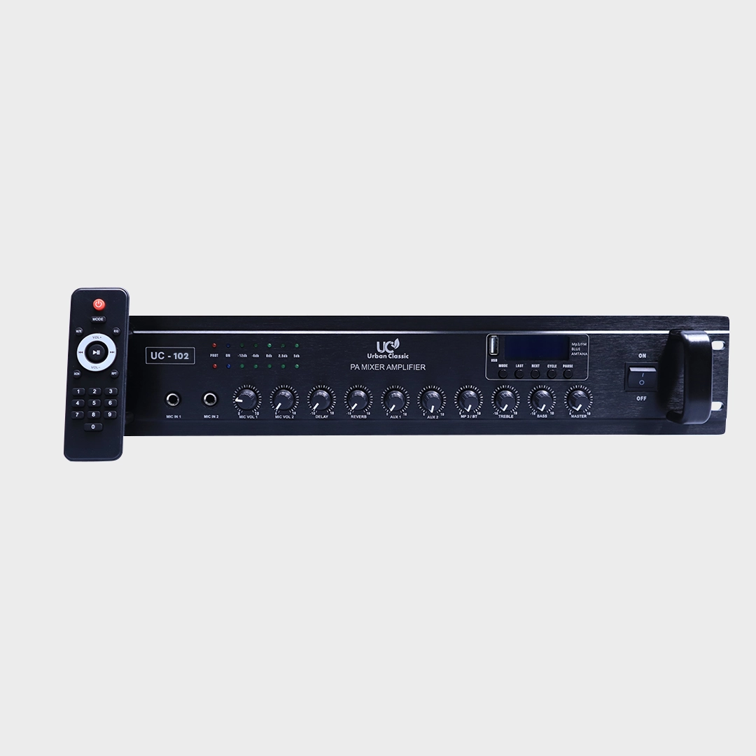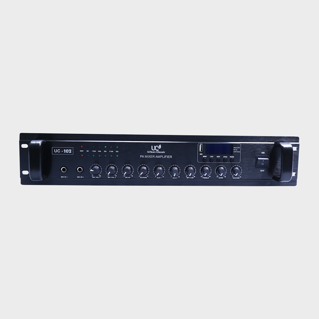 The Urban Classic UC–102 Stereo Mixing Amplifier delivers powerful 100W stereo sound (200W at 100V) with optimized frequency response, making it ideal for restaurants, cafes, and corporate spaces. With multiple input channels and seamless connectivity, it ensures rich, distortion–free audio for music and speech applications.
