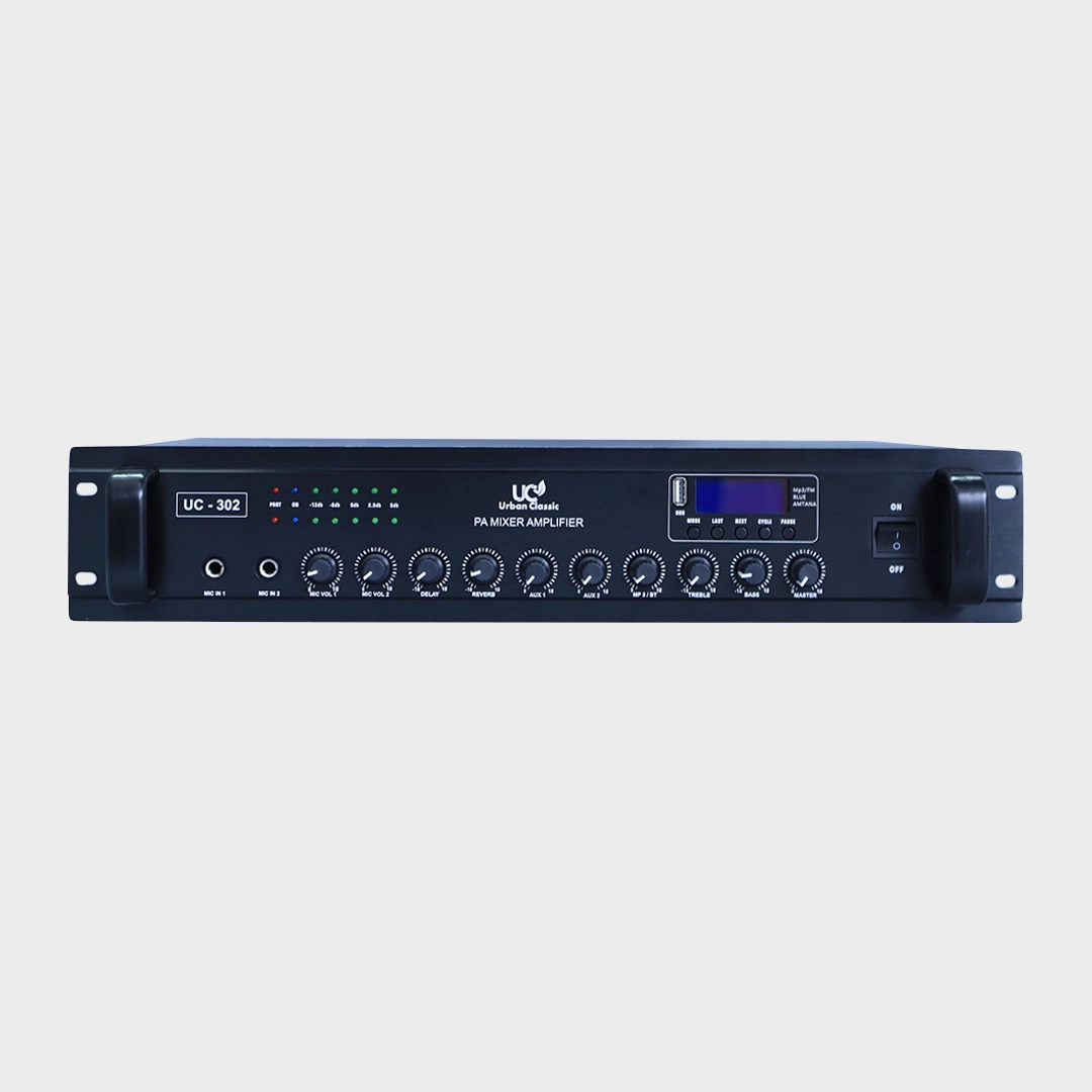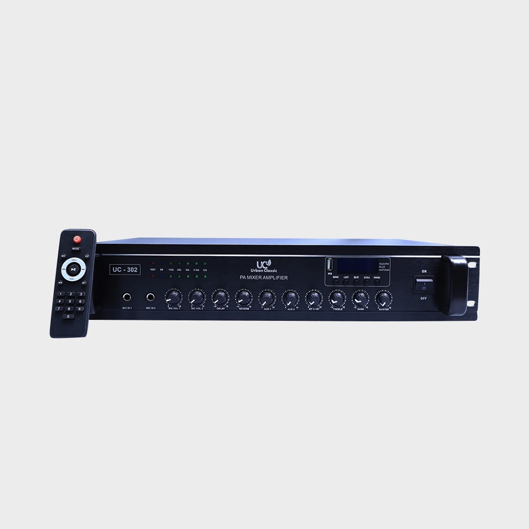 The Urban Classic UC–302 Stereo Amplifier delivers powerful 2 × 300W stereo output (600W at 100V) with advanced sound control, making it ideal for karaoke, live performances, and professional audio setups. With multiple input channels and seamless connectivity, it ensures immersive, distortion–free audio for music and voice applications.